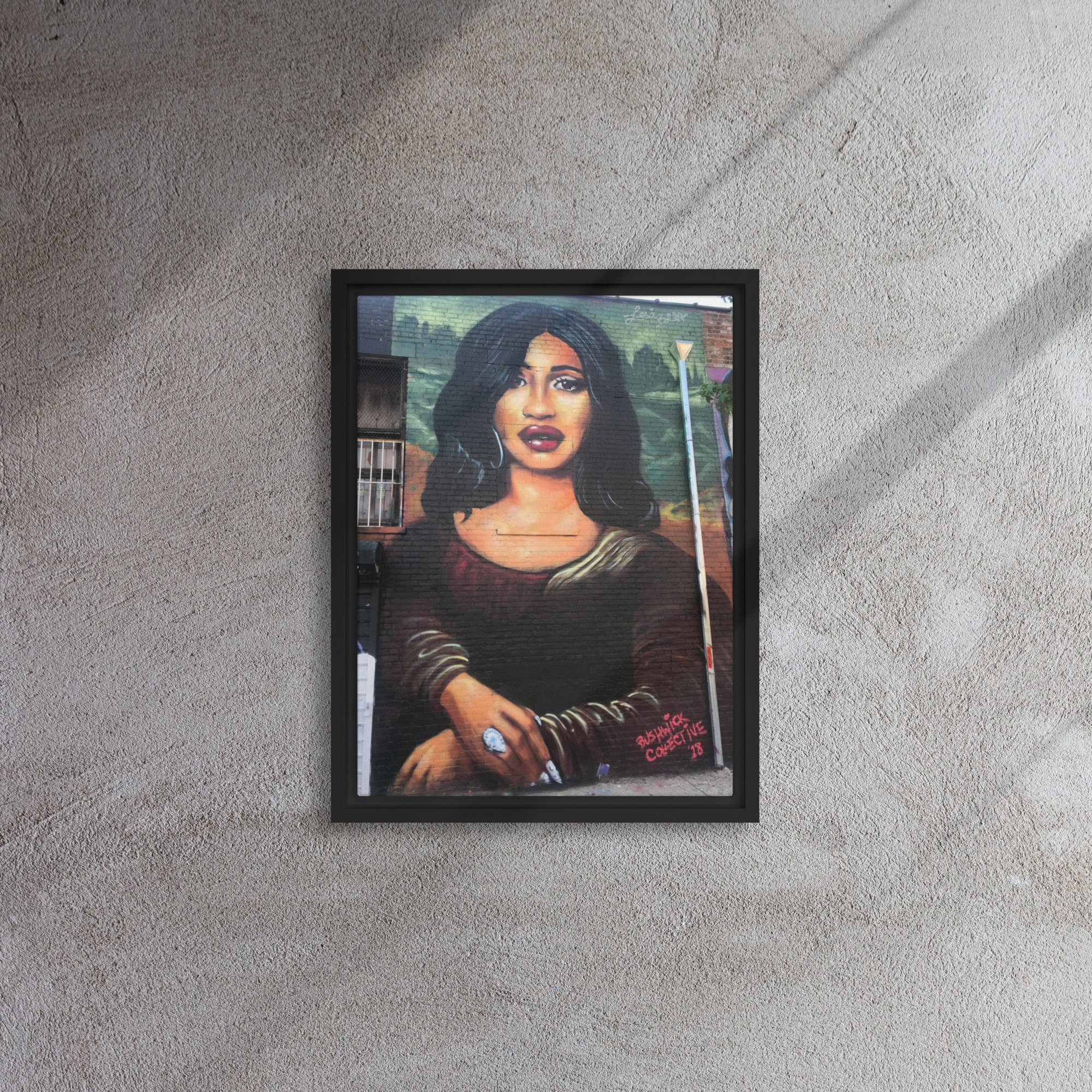 Have your very own FRAMED Shmona Lisa! Own a piece of unique urban art with our exclusive framed canvas featuring the iconic 'Lexi Bella's Shmona Lisa'. This striking artwork, originally created on a massive 40 ft wall during the 2018 Bushwick Collective Block Party, combines the classic beauty of the Mona Lisa with the contemporary flair of Cardi B. Beautifully framed, printed on the highest quality canvas capturing the essence of street art and bringing a touch of the city's vibrant art scene into your home! This high-quality pine tree framed canvas comes with rubber pads on the back corners and wall mount that makes hanging the artwork hassle-free. What’s more, the frame gives the canvas a cool floating effect!